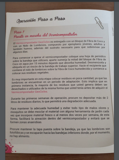 El Manual de Uso es un texto descriptivo y detallado del proceso de Vermicompostaje, especial para el uso de los vermicompostadores Geociclos. Además, es fabricado en papel reciclado certificado.